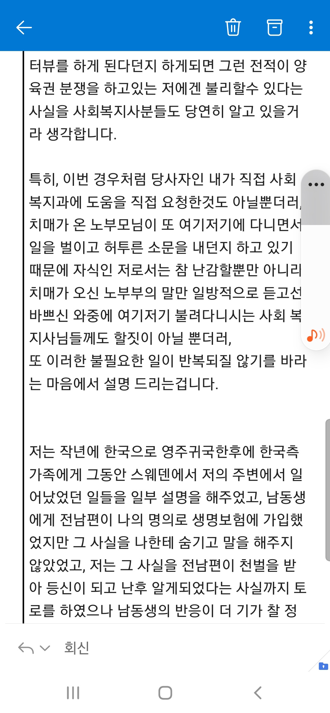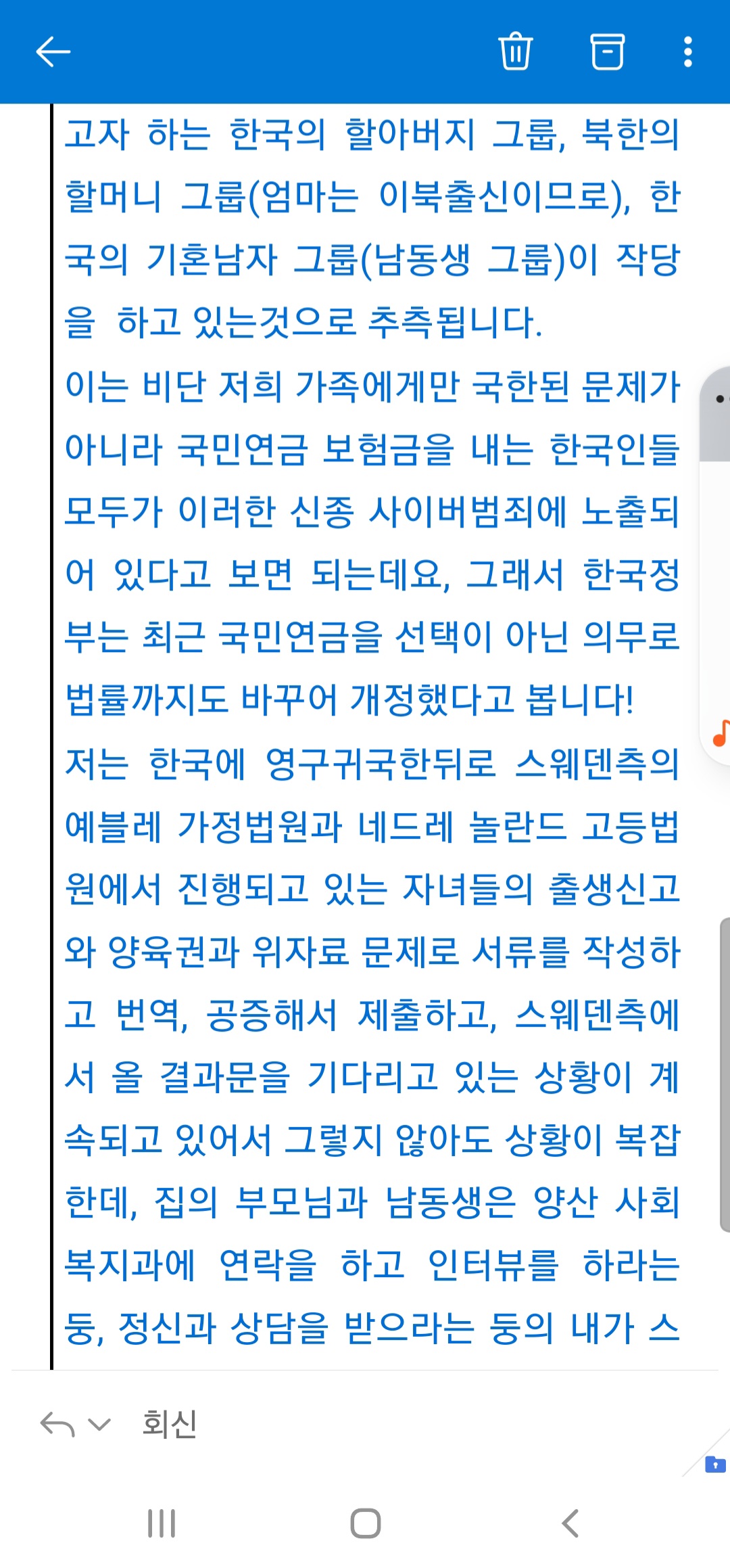 아래의 내용은 2020년 8월 15일 예블레내에서 코로나로 인해 고립되어 있다가 탈출한 이후로부터 2021년 3월 스웨덴 전남편과의 이혼후 예블레 가정법원과 네드레 놀란드 고등법원에서 아직까지 진행중인 양육권 분쟁을 하고 있는동안 일어나는 일들과 공공기관에서 주고받은 이메일들로서 저는 이를 매일 증거로 기록하고자 합니다.