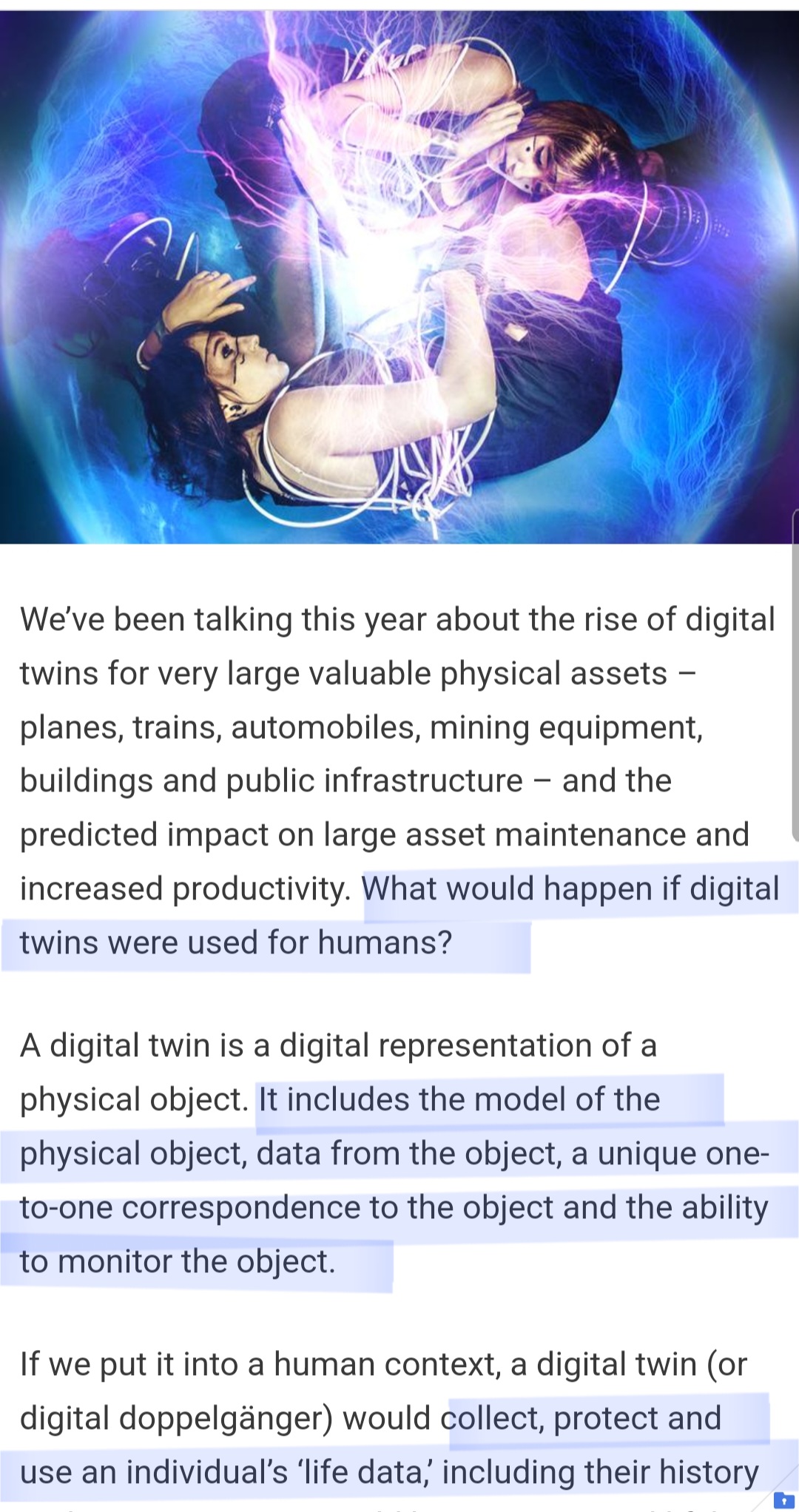 비행기, 기차, 자동차, 광산 장비, 건물, 공공 인프라 등과 같이 가치 있는 물리적 자산에 대한 디지털 트윈(digital twins) 개념에 대한 논의가 증가하고 있다. 그렇다면 디지털 트윈 개념이 인간에게 적용되면 어떻게 될까?