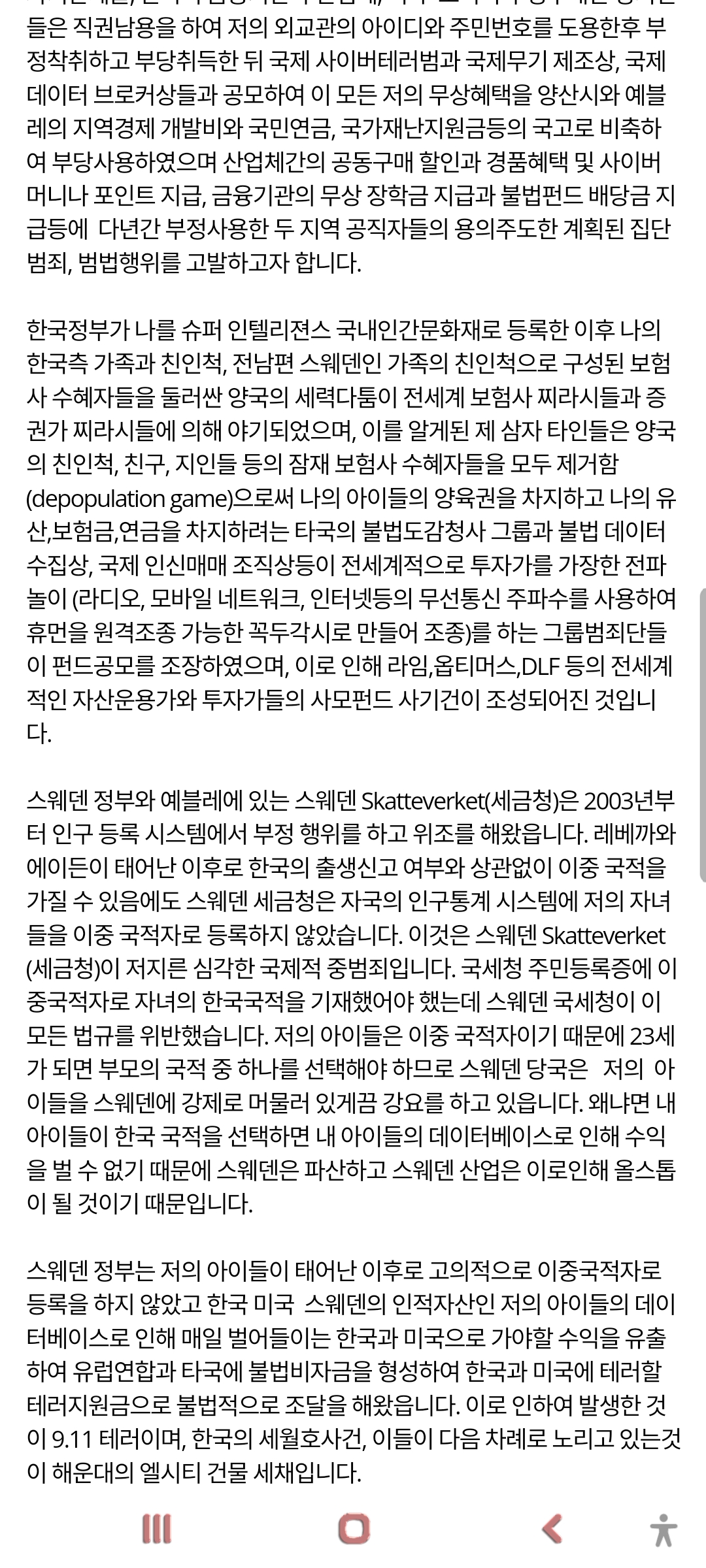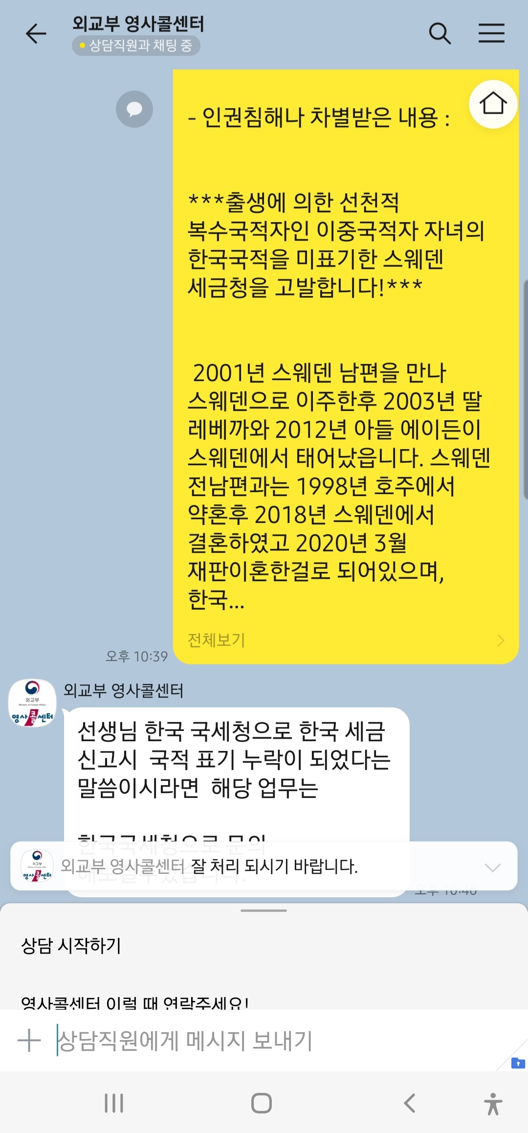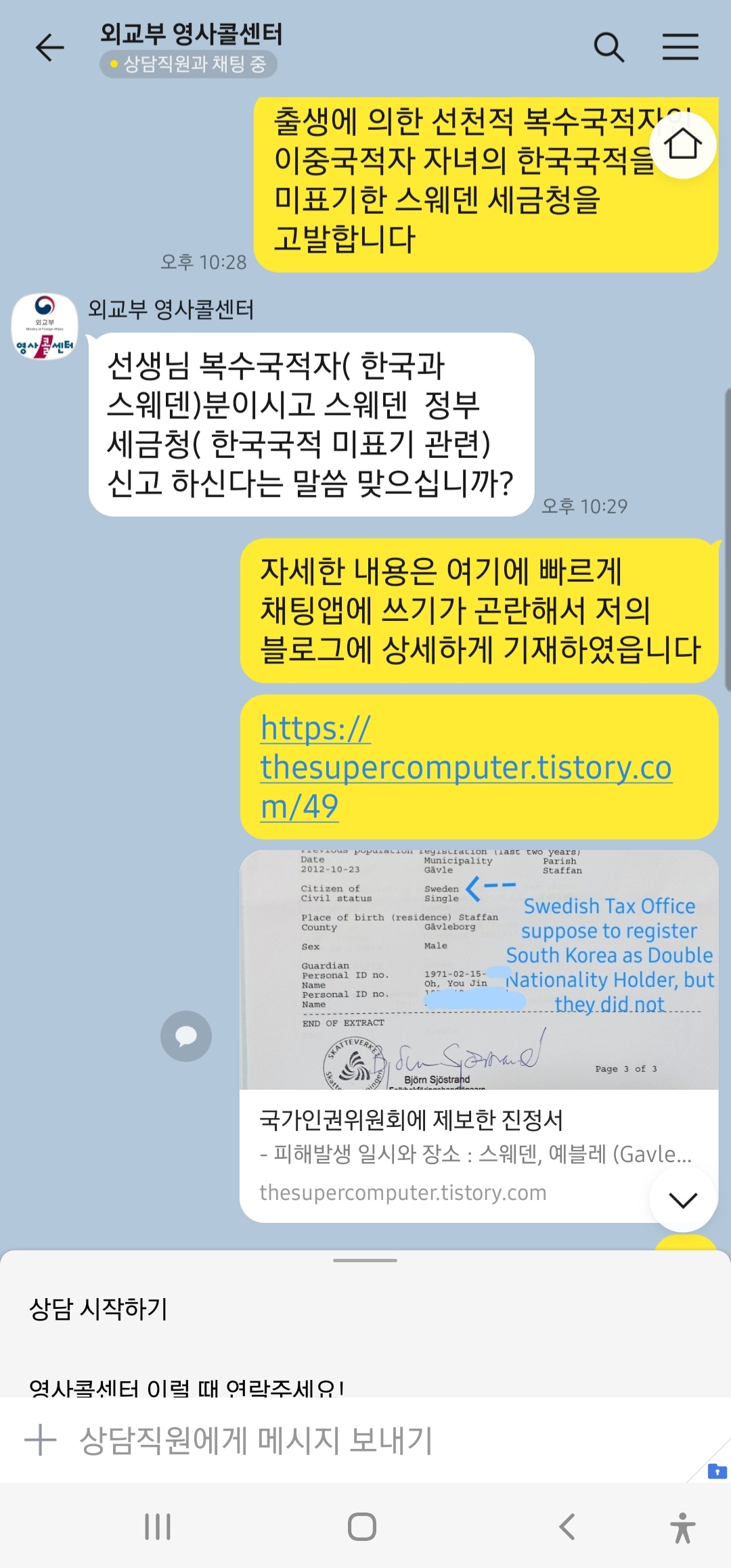 “선천적 복수국적자인 이중국적자 자녀의 한국국적을 미표기한 스웨덴 세금청을 고발할수 있도록 서명 부탁드립니다! 스웨덴은 한국이 저의 자녀의 데이터로 국고수익(프로비져닝)을 벌지못