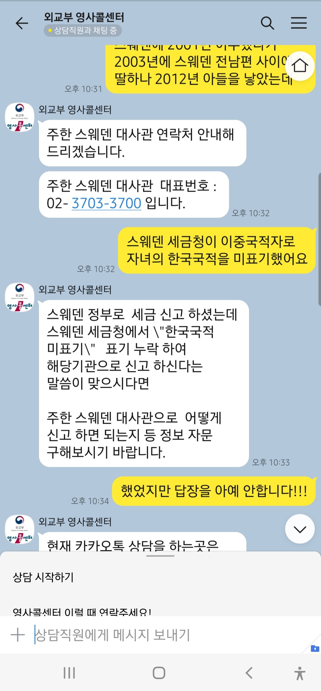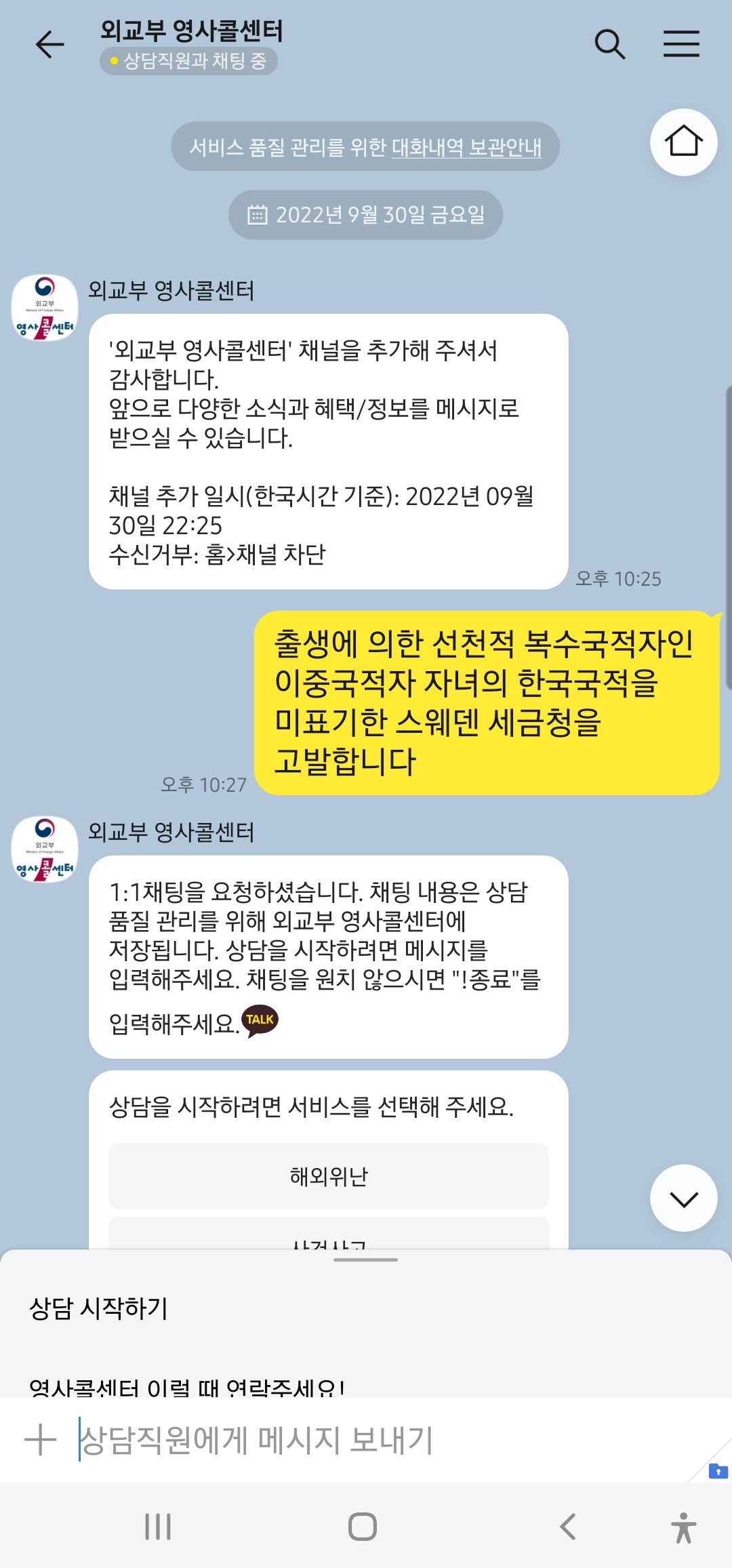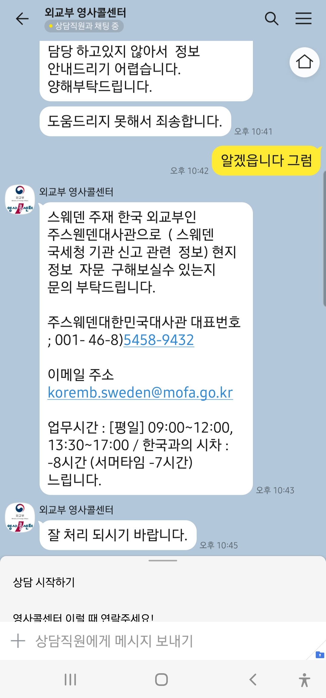 외교부 영사 콜센터의 카카오톡 상담에 문의한 결과, 주스웨덴 한국 대사관으로 문의해 보라는 답 변만 들었고 별 도움이 안되었기에
