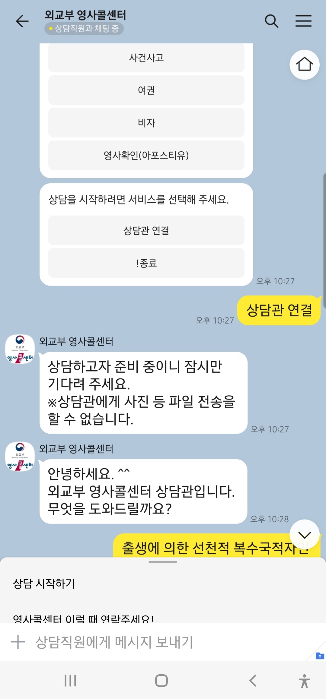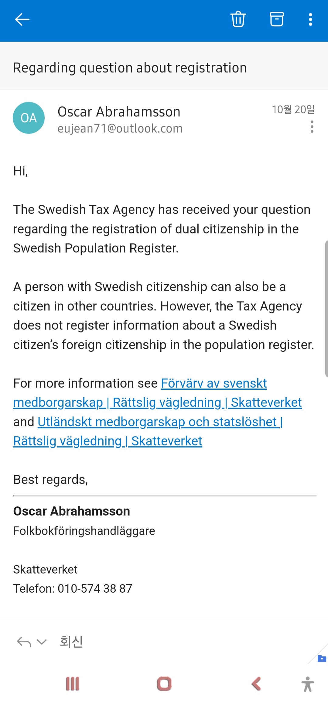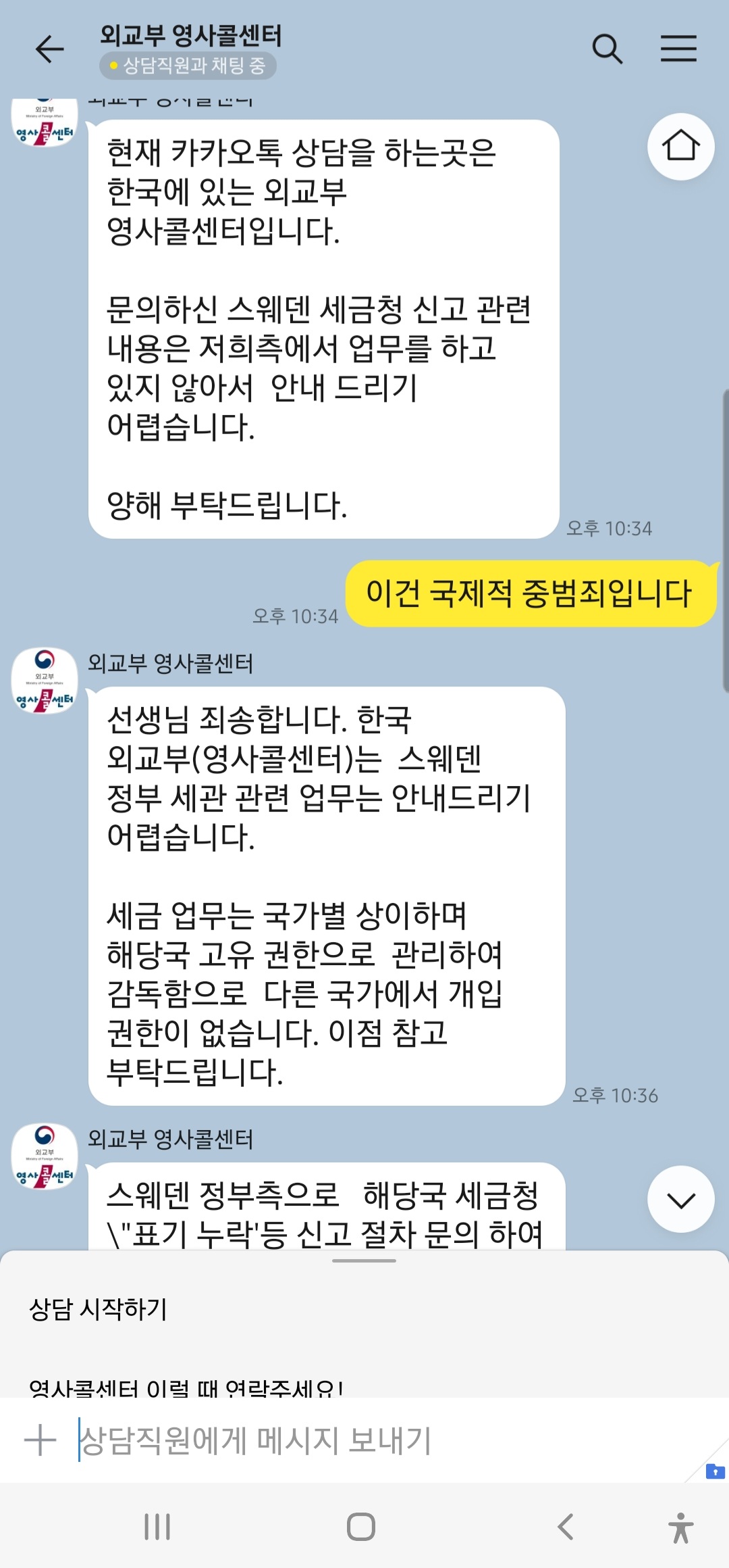 외교부 영사 콜센터의 카카오톡 상담에 문의한 결과, 주스웨덴 한국 대사관으로 문의해 보라는 답 변만 들었고 별 도움이 안되었기에