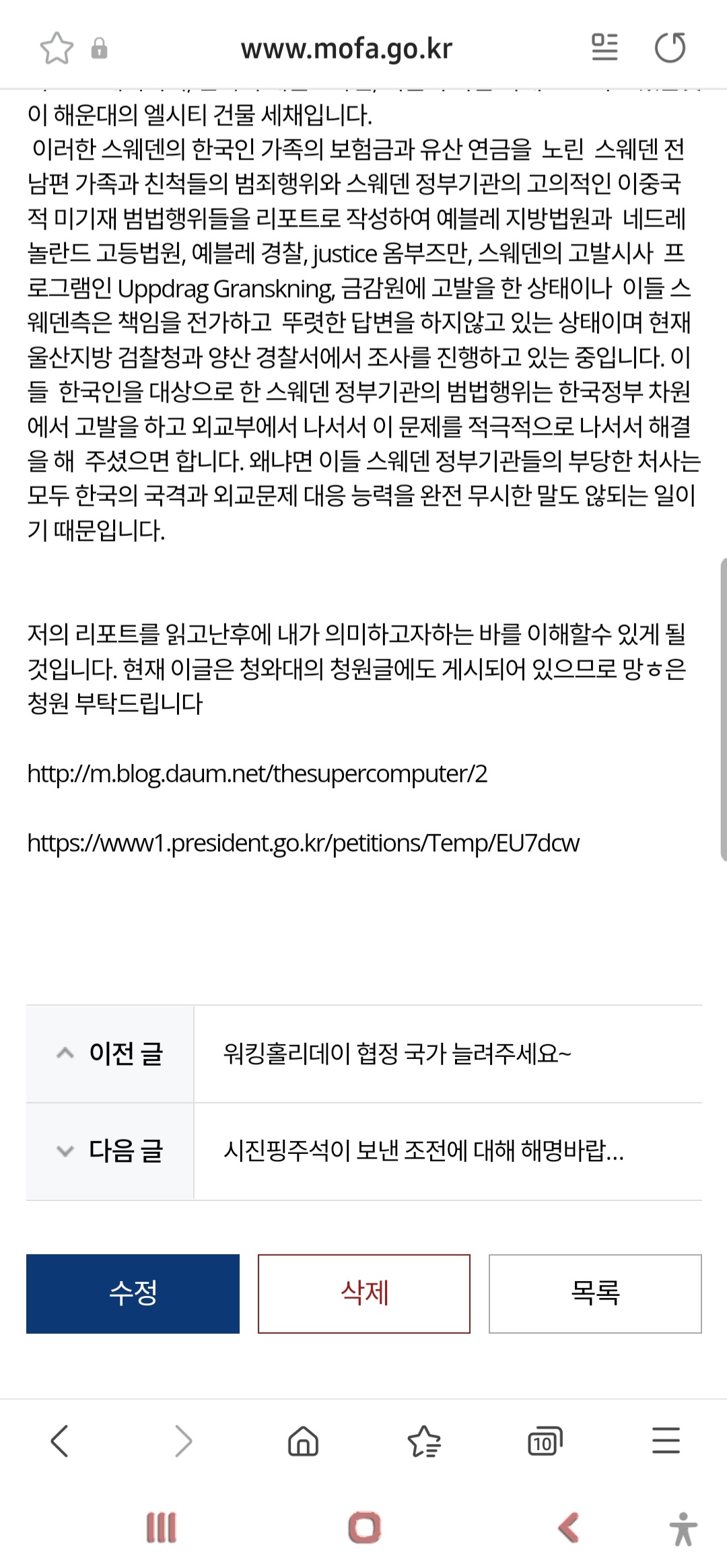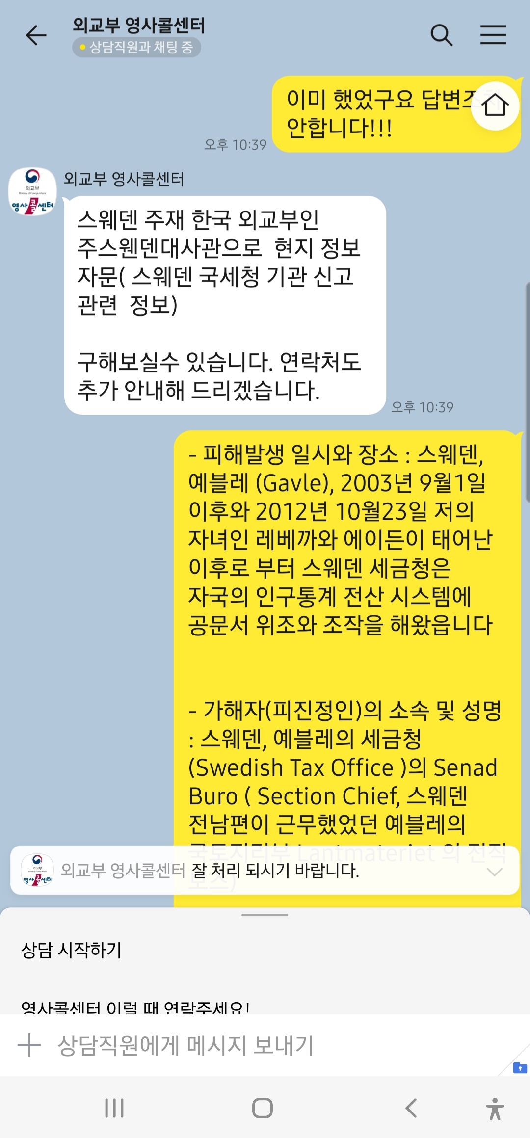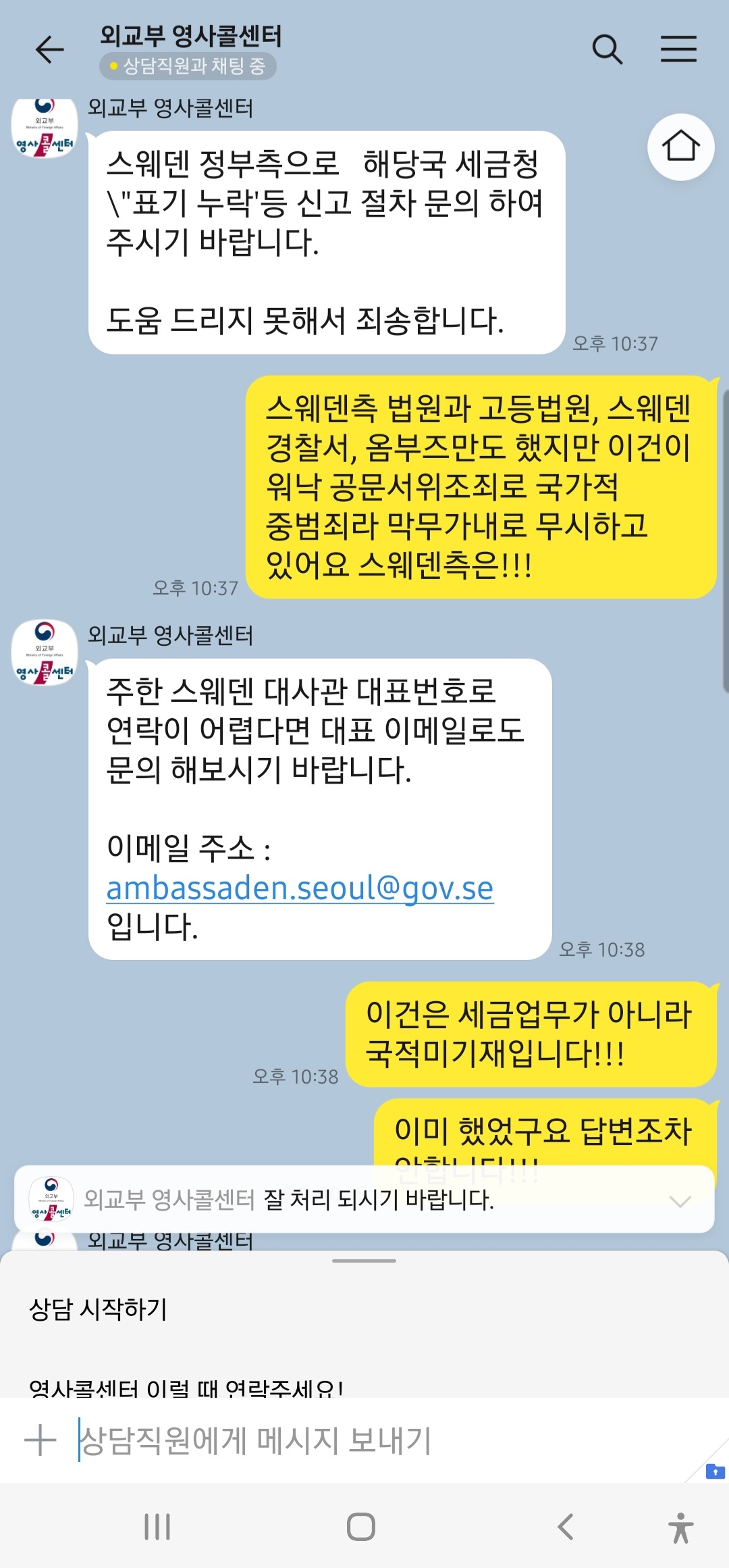 서로 이렇게 스웨덴과 한국의 정부기관과 공공기관들은 서로서로 책임전가만을 하고있고, 고의적으로 시간끌기만을 하고 있다는 것이 분명한데,