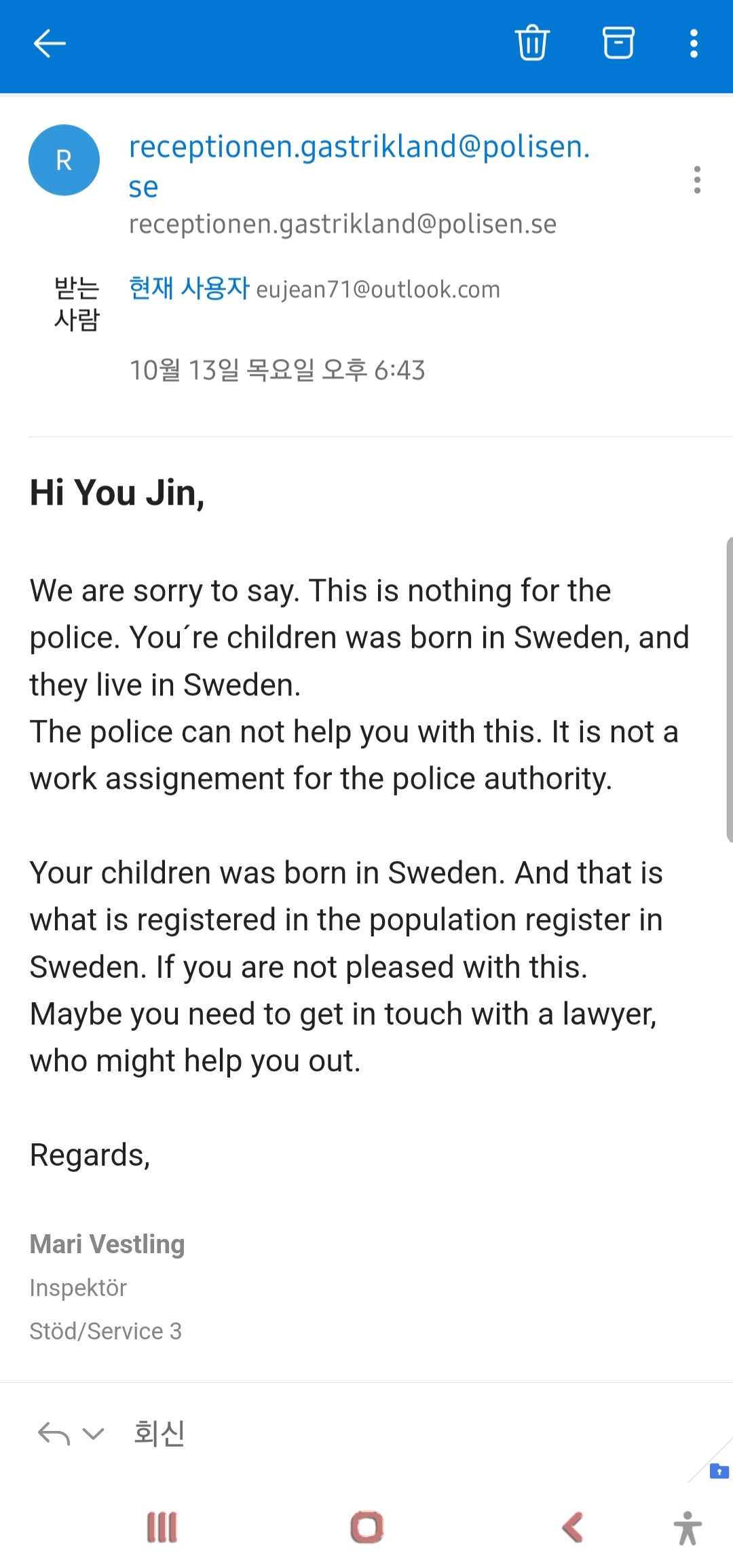 주한 스웨덴 대사관과 주스웨덴 한국 대사관, 예블레 경찰서, 예블레의 주민등록센터에 이메일을 보낸 결과