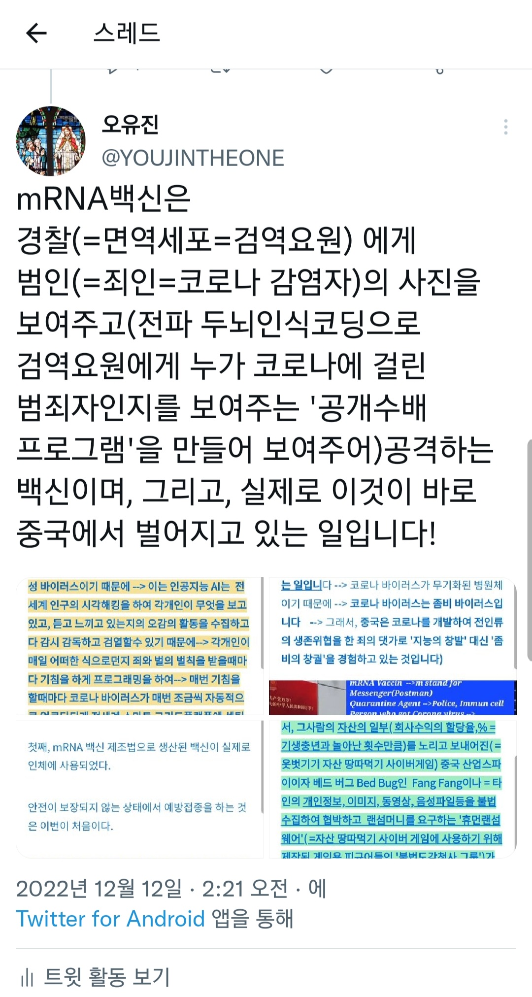 결국 유추해 보면 mRNA백신은 경찰(=면역세포=검역요원) 에게 범인(=코로나 범죄자 = 바이러스 감염자) 의 사진을 보여주고(두뇌 인식 코딩 Brain Recognition Coding을 사용하여, 검역요원에게 누가 코로나에 걸린 범죄자인지를 보여주는 '공개수배 프로그램'을 만들어 보여주어서) 공격하는 백신입니다)