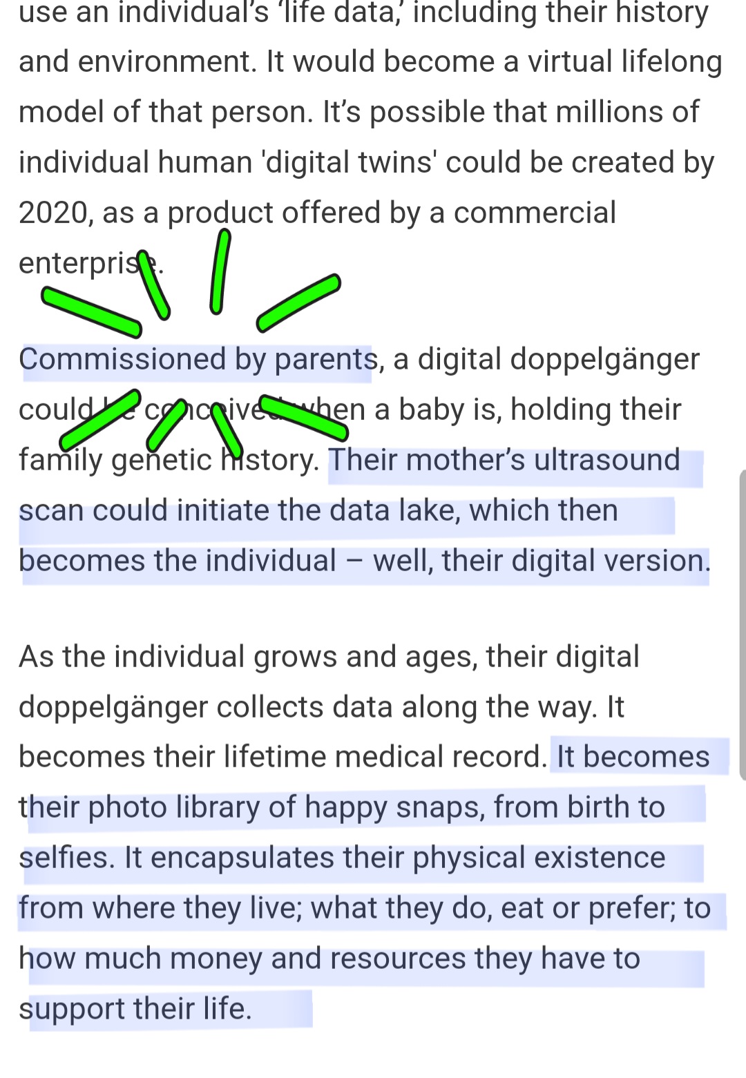 --> 그 도시에 거주하는 주민들을 심시티상의 3D 아바타 피규어로 DNA복제클론인 *"디지털 도플갱어"(= 디지털 자산트윈= 매일 가상현실공간인 World Wide Web상에 수집되는 모든 개인정보가 모여서 만들어지는 디지털버젼의 또 다른 나로써, 아래의 사진에서도 보여지듯이, 심지어 과학자들과 연구자들마저도 이들 도플갱어는 부모에 의해 소유권이 주어지는 Commissioned by Parents가 된다고 명시하고 있음)을 제작한뒤에