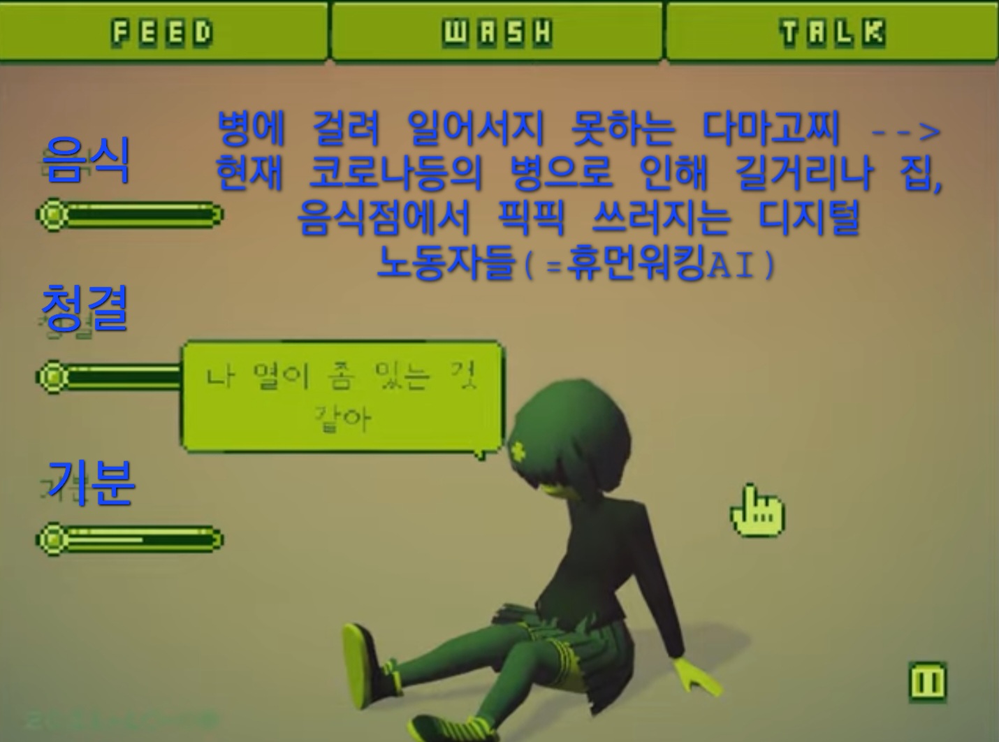 5G가 상용화되고 마스트타워가 보급된 이후 휴먼들은 '스마트폰화된 사이보그이자 디지털 노동자'로 자체개발되고 있는데,