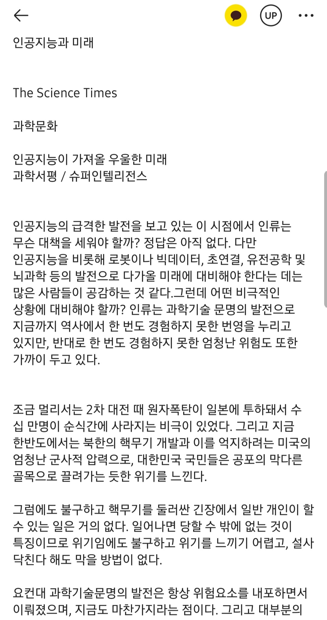 인공지능과 미래The Science Times과학문화인공지능이 가져올 우울한 미래과학서평 / 슈퍼인텔리전스인공지능의 급격한 발전을 보고 있는 이 시점에서 인류는 무슨 대책을 세워야...