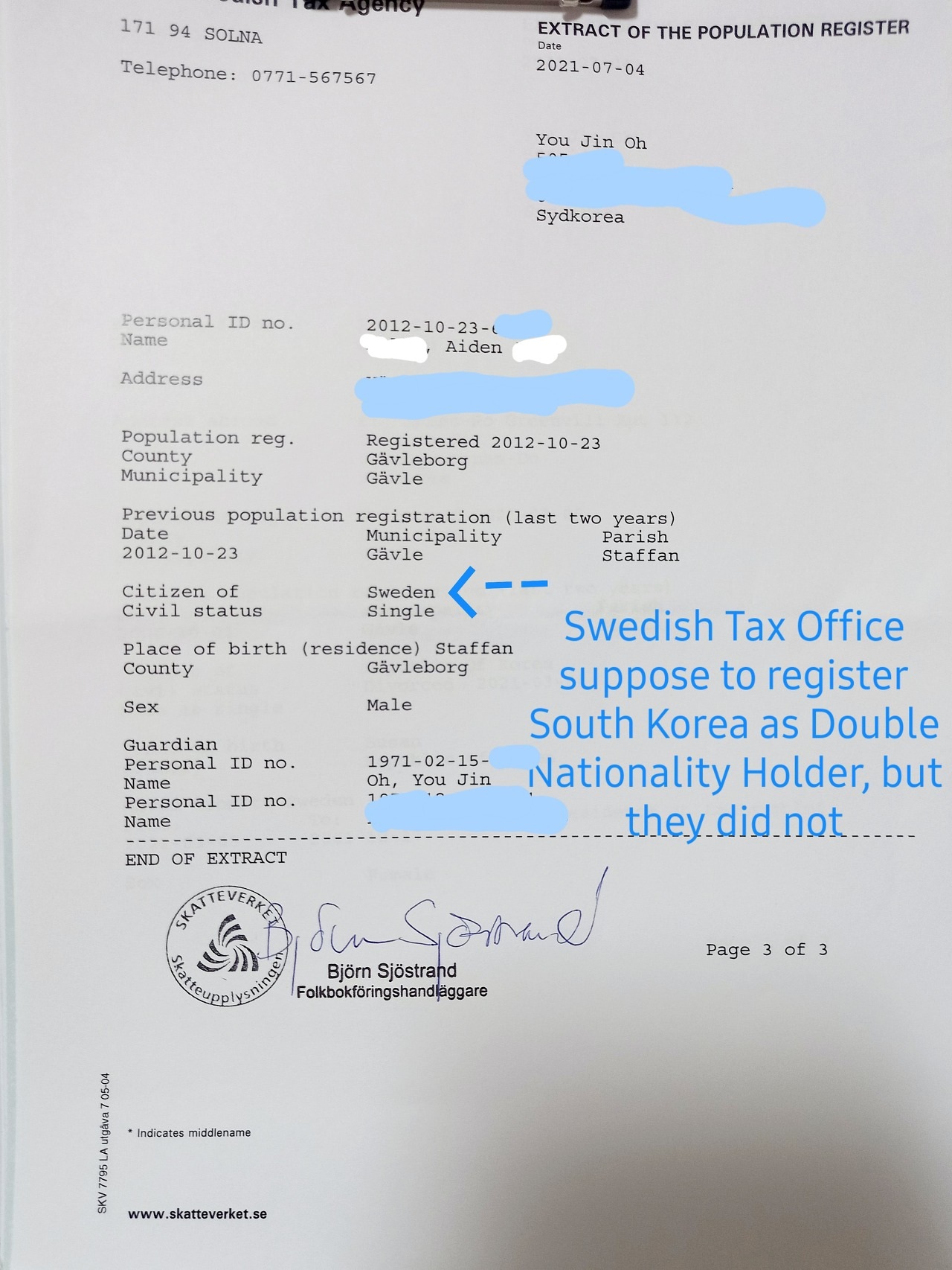 *** I filed a complaint with the Swedish Tax Office for not indicating the South Korean nationality of my childrens of dual citizenship who was born with Multiple Nationalities ***