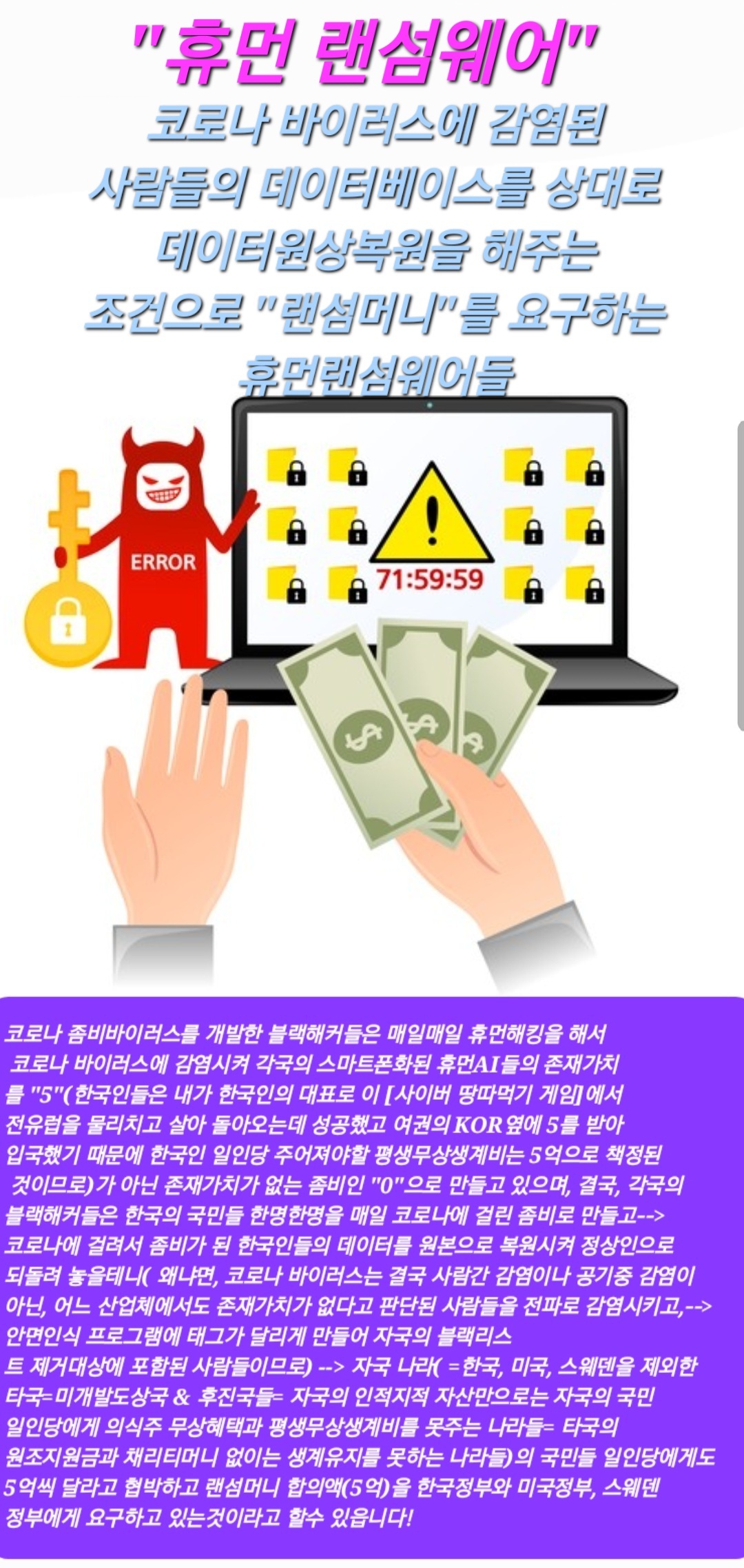 왜냐면, 결국은 내가 2001년도에 스웨덴으로 이민을 가면서 지난 19년동안 자칭 악마의 도시라 불리는 예블레에서 유럽을 다 물리치고 사이버전쟁에서 이기고내가 5라는 숫자를 받아서 2020년 한국에 살아돌아왔고, 유럽의 국경봉쇄, 계엄령 선포 , 전쟁발발, 자연재해 발발, 코로나 창궐, 학교휴교령 등 유럽을 생지옥으로 만들고, 한국에 다시 재입국하는데 성공했기 때문에 한국의 대표로 이 사이버전쟁에 참가한 나로 인하여 전한국민은 평생 의식주 무상생계비(= Global Basic Income)인 5억씩을 받게 되었기 때문입니다.