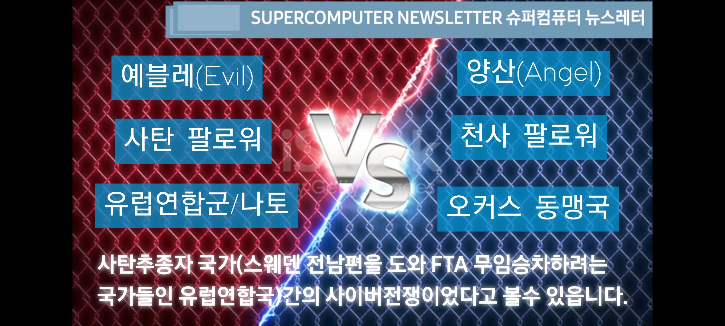 천사들국가간(오커스동맹) verses(대) 사탄추종자 국가(스웨덴 전남편을 도와 FTA무임승차하려는 국가들인 유럽연합국)